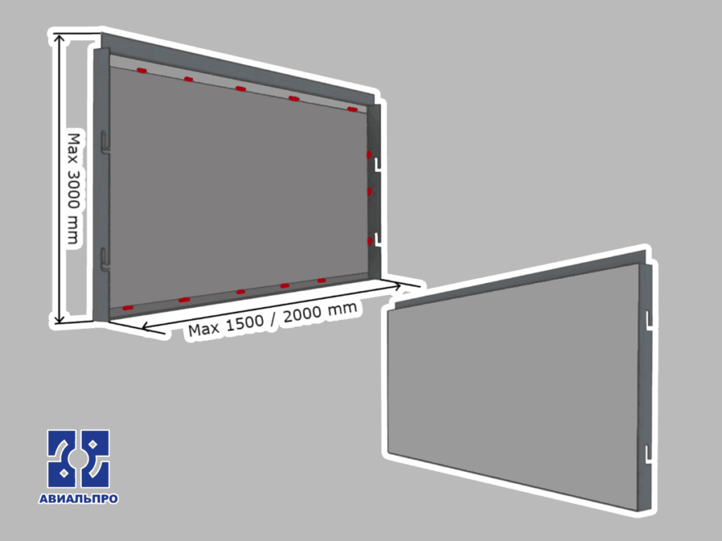 Стандартные габариты: высота — 1250, 1500, 4000 мм; ширина — 1250, 1500, 4000 мм.